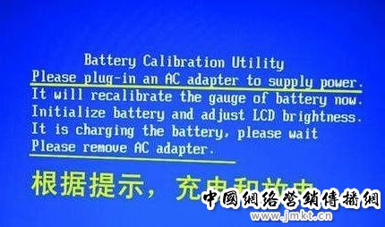 step 3 :这时屏幕会变成蓝色,并有英文提示,要求把笔记本的电源适配器插上给电池充电。等电池电量充满后,屏幕又提示用户断开电源适配器(图2)。之后笔记本开始持续对电池放电,直到电池电量耗完