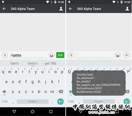 360手机卫士阿尔法团队第一时间为用户提供了检测方式,用户可通过在任意聊天对话框中输入“//gettbs”可判定是否已经收到此漏洞的更新。如果tbsCoreVersion大于036555则说明该漏洞已经修复,用户无需担心,否则则说明微信受该漏洞影响。