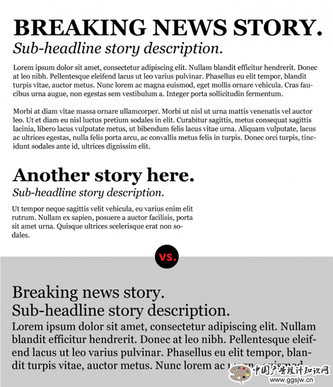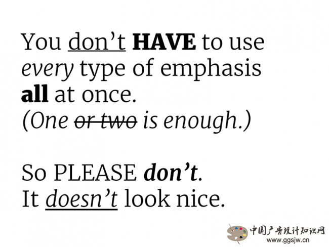 有时候你需要强化某个部分,会在视觉上进行强调,让它从整个设计中脱颖而出。文字部分常见的手法很多,斜体、粗体、下划线、大写、增大字体大小,等等。但是千万不要将所有的强调方式都用在同一篇文字同一个段落中,这样会让它看起来凌乱不堪。
