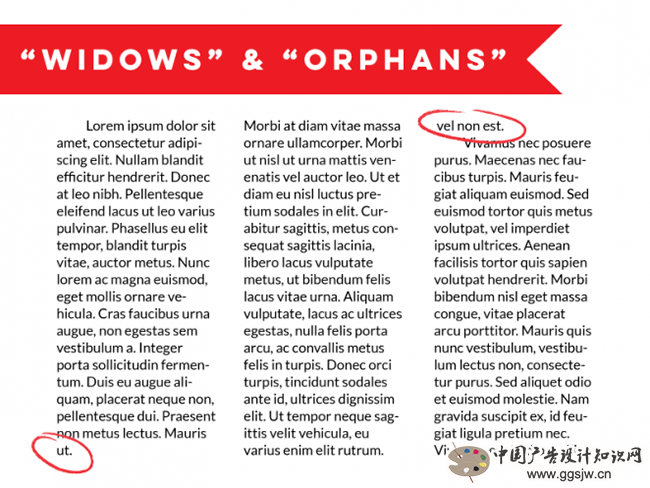 “Orphans”和“Widows”是印刷排版中的术语,通常指的是行货列、页头和页脚段落最后仅有一两个词构成的短行之类的东西。在文字排版占主体的设计项目中,这些行或者列非常的扎眼,你如果不想让大片的留白打断排版的连续性,最好的解决方案是微调段落宽度、间距。
