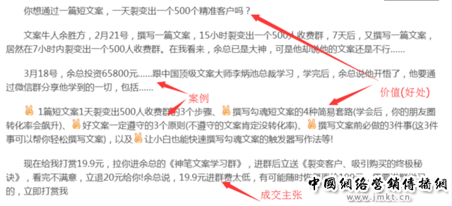 价值(产品能提供具体好处)、案例(达成这种好处的多个震撼案例)与主张(成交主张)!