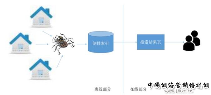 搜索引擎的工作分为离线部分和在线部分,离线部分负责抓取网页,构建倒排索引,在线部分负责提供前台搜索接口,根据用户query的词取倒排索引,计算排名,进行一些本地化/个性化的处理,最后返回10条结果的搜索结果页。整个信息流自左向右流动。