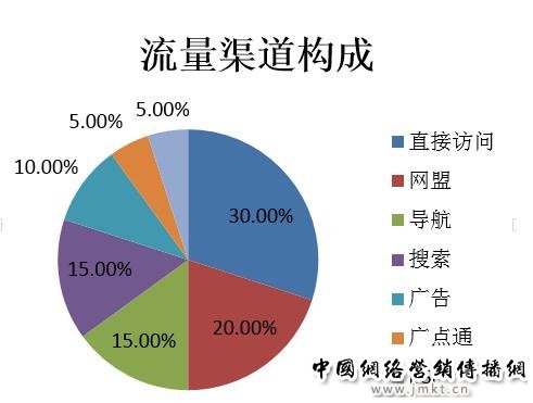 不同的行业/不同的承载方式(网站/APP/微信/淘宝店/自媒体等),有不同的流量获取渠道和方式,不同渠道的流量占比也会各有不同。比如京东的网站,应该包括但不限于如下一些渠道,直接访问,搜索引擎(PPC/品专/SEO),导航站,返利站,导购站,输入法弹框,网盟(自有/第三方),广告,微信入口等,具体到SEO,两年前听到一个未经证实的数据,京东SEO流量占总流量的比例大概11%。作为对比,某知名在线旅游网站,SEO流量占比达到了30%。对于垃圾站群推的文学/影视类网站,SEO流量的占比应该不低于90%吧。不同渠道的流量,转化率也会有所差异。对于电商来说,直接访问的流量,返利/导购网站来的流量,一般都有相对明确的目的,也有一定的认知,所以决策曲线短,成单的概率大。下面画了一幅很假的饼图充数:)
